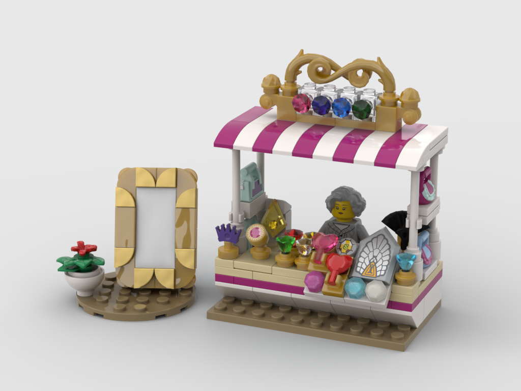 Introducing the Market Jewelry Stand: a beautifully detailed market stall that adds charm and character to any build! This jewelry stand is packed with tiny accessories, including necklaces, rings, and bracelets, making it the perfect spot for minifigures to browse and shop. With its vibrant colors and thoughtfully designed display, the Market Jewelry Stand is an eye-catching addition to any street market, bazaar, or craft fair scene, bringing a unique sparkle to your creations.