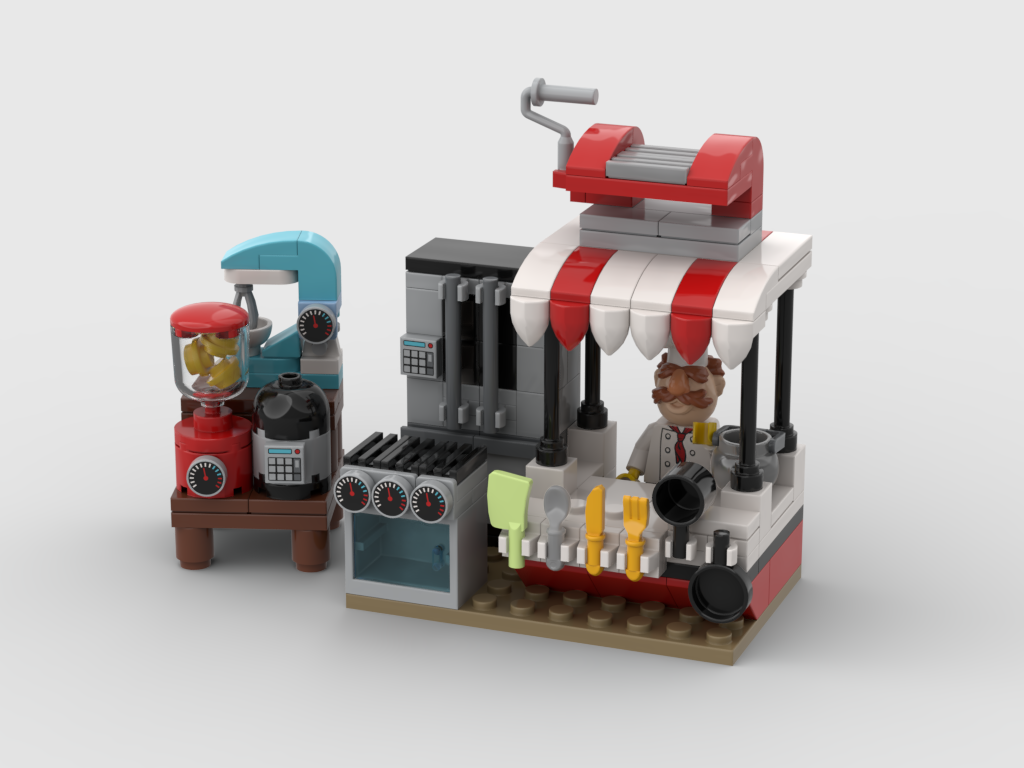 Introducing the Market Kitchen Stand – a sleek, modern setup showcasing a range of essential kitchen appliances! This MOC features everything from high-tech blenders to a stylish refrigerator and a functional oven, adding a realistic touch of contemporary convenience. Perfect for creating a marketplace or kitchen showroom.